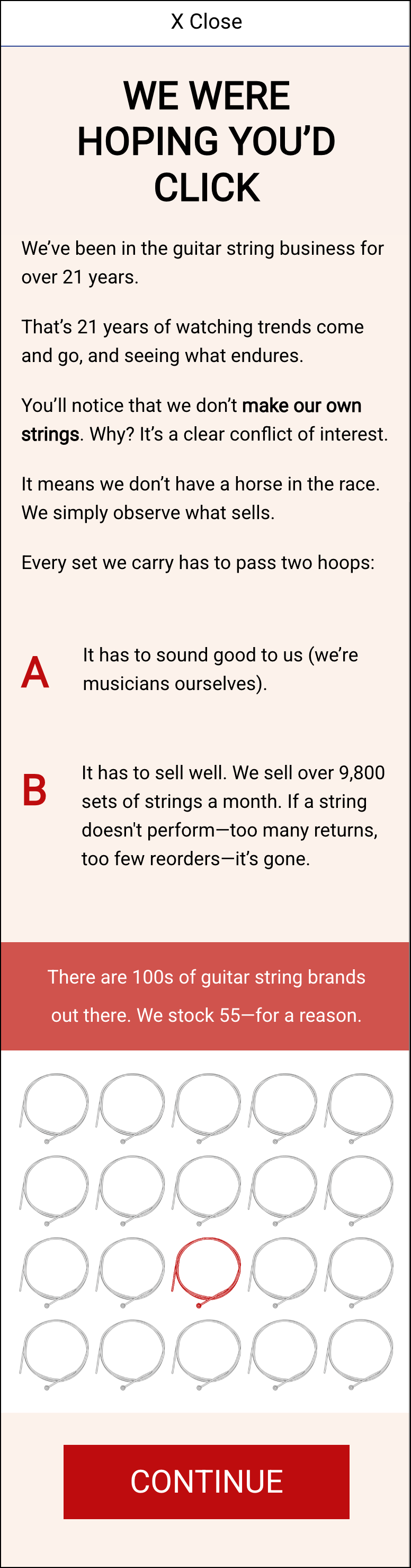 But first, a little about the client: StringsAndBeyond.com has been around since 2002, and in that time, they’ve sold a whopping 4.4 million guitar string sets. They’ve served 297,000 musicians.